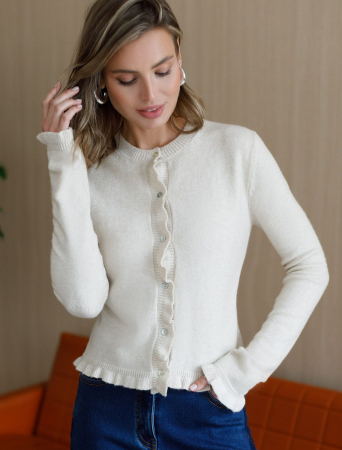 Кардиган выполнен из мягкой меланжевой пряжи с Романтичности прямому силуэту добавляют мягкие воланы по линии пуговиц, на манжетах и краю изделия. Застежка на пуговицы из натурального перламутра. Изделие очень приятное к телу, совершенно не колется и отлично сохраняет тепло. Сочетается в костюме с брюками D38.013, D38.012 и юбкой D36.016