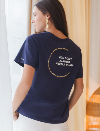 Перевод надписи: «Не всегда нужен план. Иногда просто нужно сделать вдох, довериться, и ты увидишь, что произойдет» Футболка выполнена из премиального хлопка. Крупная надпись выполнена красками, маленькая - золотой фольгой с устойчивым покрытием. Наличие эластана в составе способствует комфорту и формоустойчивости, помогая сохранить изделие в течении долгого времени в идеальном состоянии. Модель дополнена фирменным металлическим логотипом бренда.