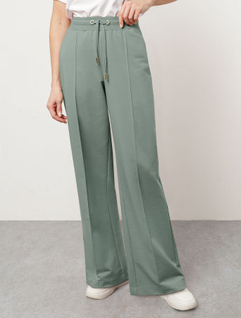 Брюки светло-оливкового цвета прямого кроя выполнены из премиального футера-двухнитки. Лаконичный силуэт поддерживают застроченные стрелки, зрительно вытягивающие силуэт. Удобный пояс на резинке регулируется хлопковым шнурком с золотистой фурнитурой. Наличие эластана в составе изделия гарантирует комфорт и долговечность изделия. Эластичный материал хорошо пропускает воздух, позволяя телу дышать, и легко тянется, не ограничивая движения.