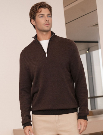 Черно-коричневый джемпер с длинными рукавами выполнен из мягкой хлопковой пряжи с добавлением акрила. Высокий воротник застегивается молнией. За счет переплетения светлых и темных нитей получилась фактурная меланжевая модель, которая, отлично держит тепло и почти не ощущается на теле. Сочетается с футболками, денимом и с чиносами, любой обувью.