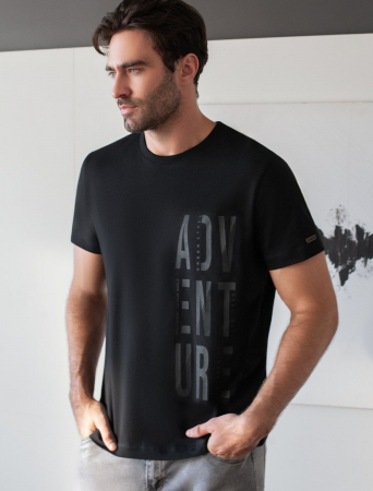 Базовая футболка черного цвета из премиального хлопка с эластаном полуприлегающего кроя станет универсальным решением для любого случая. Прямой крой обеспечивает комфортную посадку на любую фигуру, включая большие размеры, подходит как на низкий, так и на высокий рост. Выполненная из натуральной ткани, она обладает дышащими свойствами, а за счет эластичности сохраняет форму даже после длительного ношения и многочисленных сирок. Однотонная футболка выполнена в минималистичном стиле, дополнена принтом в виде надписи. Перевод надписи: Adventure - Приключение. На рукаве нашивка из эко-кожи с логотипом VILATTE. Подходит как классический вариант для работы в офис, так и для повседневной носки или занятий спортом. Мягкая ткань приятна к телу, не вызывает дискомфорта и идеально подходит для дома или летних прогулок благодаря короткому рукаву. Простая и практичная футболка станет базовым элементом вашего гардероба. Она легко сочетается в спортивном или классическом стиле. Стрейч-ткань поддерживает свободу движений и подчеркивает индивидуальный стиль каждого мужчины.