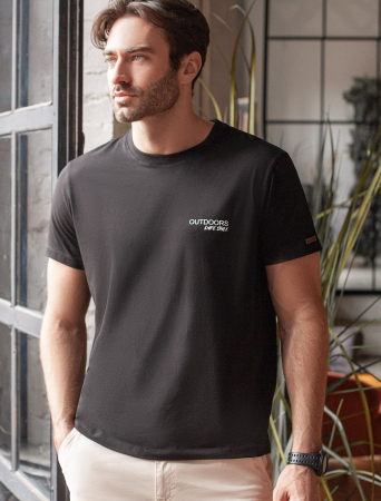 Перевод: "Стиль жизни - вне замкнутого пространства" надпись выполнена пуффом и красками с устойчивым покрытием. Футболка выполнена из премиального хлопка. Особым преимуществом является наличие эластана в составе изделия. Очень приятная на ощупь и комфортная при носке, футболка сохранит свой безупречный внешний вид в течении долгого времени. Модель дополнена нашивкой из эко-кожи с логотипом VILATTE.