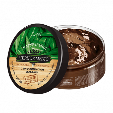 Для бани и душа. 16 полезных трав в составе! Густое черное мыло обладает выраженными увлажняющими и питательными свойствами, бережно смягчает кожу тела. Способствует тщательному очищению волос, восстанавливает их структуру, стимулирует обновление клеток кожи головы. Эфирное масло эвкалипта известно высоким содержанием фитонцидов – веществ, которые активно подавляют и убивают рост и развитие болезнетворных бактерий.