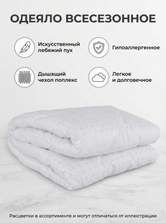 Чехол одеяла выполнен из поплекса, надежно удерживает наполнитель и приятен на ощупь. Чехол одеяла представлен в ассортименте возможных расцветок и может отличаться от фото на сайте.
