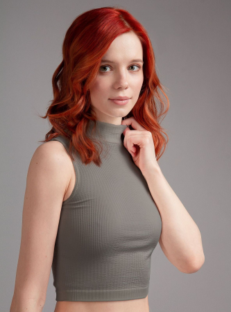 Майка-топ выполнена из полиамида песочного цвета, в рубчик, с высоким горлом, без рукавов, укороченная, облегающая, на мягкой резинке.