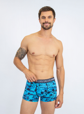 Боксеры синего цвета из плотного хлопка. Белье подходит для повседневной носки: комфортная посадка, отличная вентиляция и свобода движений. Трусы облегающего кроя, гульфик без лишней фурнитуры. На поясе широкая эластичная резинка для мягкой фиксации на бедрах.