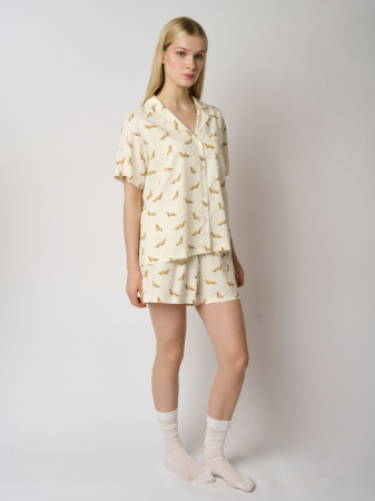 Пижама в молочном оттенке с принтом. Сшита из нежной к коже вискозе и дышащего хлопка, подходит для любого времени года. Рубашка прямого кроя с пуговицами в тон и аккуратным нагрудным карманом. Шорты с плотной эластичной резинкой.