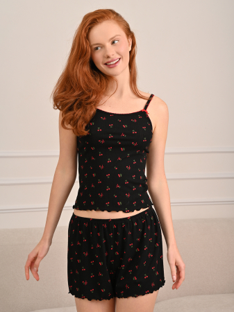 Женская пижама сшита из хлопка и бамбука. В ней удобно и спать, и отдыхать дома. Украшена принтом и имеет перформацию — так кожа лучше «дышит», ткань ощущается более легкой и приятной в жаркую погоду. Шорты свободного кроя. Майка облегает и подчеркивает фигуру. Посадка регулируется несъемными лямками.