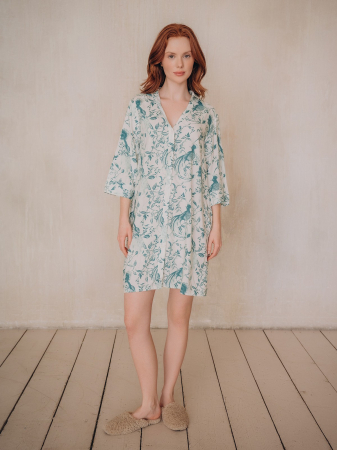 Платье легкое, свободного кроя с V-образным вырезом. Длина выше колена. Есть короткие рукава и удобные боковые карманы, куда легко помещается смартфон и другие мелочи. Платье с цветочным узором в зеленых и синих тонах на светлом фоне.