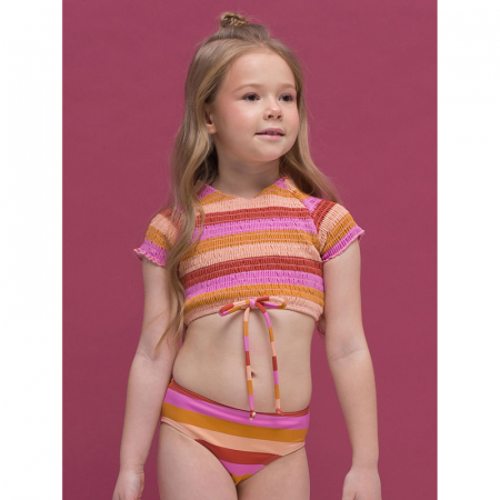 Состав: верх: 80%полиамид 20%эластан, подклад: 100%полиэстер, низ: 80%полиамид 20%эластан, подклад: 100%полиэстерОписание: Модный раздельный купальник для девочек. Яркий купальник с принтом для юной русалочки и законодательницы моды пляжа и моря. Верх - топ кроп, укороченная футболка с рукавами реглан, круглой горловиной. Весь топ собран параллельными эластичными строчками. По переду топа пришит бантик из основной ткани. Низ - трусы с увеличенной высотой посадки. Топ можно носить отдельно с шортами, велосипедками все лето. Купальник для девочки с принтом в полоску создан из качественной, специализированной ткани, хорошо пропускает воздух, плотно прилегает к телу ребенка и не соскальзывает во время купания. Костюм для плавания не становится тяжелый при намокании и очень быстро сохнет. Благодаря эластичности полотна, купальник детский комфортно сядет по фигуре, его легко надевать и снимать. Стильный и практичный купальник для пляжа и для бассейна, подойдет для водных видов спорта, на пляж, для отдыха. Красивый купальник подойдет для малыша, для детей и подростка, которые любят загорать на пляже и купаться в воде. Защитит от солнца и подарит максимум комфорта и свободы движений.