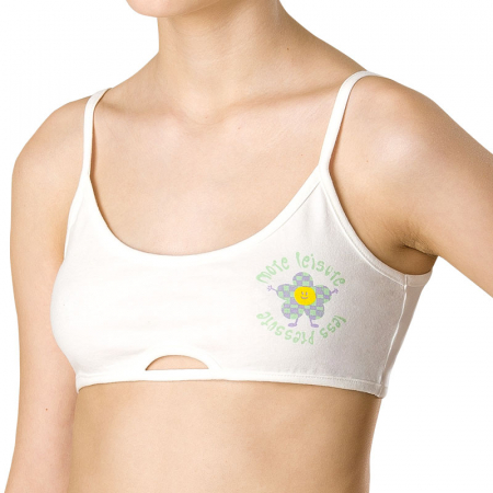 Состав: 93%хлопок 7%эластанОписание: При выборе белья для своего ребёнка, каждая мама хочет быть уверена в его качестве и в том, что ребёнку будет комфортно. Наш укороченный топ для девочки полностью соответствует этим требованиям. В составе ткани преобладает хлопок — бра приятно на ощупь, великолепно пропускает воздух, кожа ребёнка дышит. Эластан обеспечивает изделию прекрасную форму надолго. Ткань отличного качества и грамотный крой — залог идеальной посадки белья. Ребёнок чувствует себя комфортно на протяжении всего дня. Тонкие мягкие бретели не сползают и не давят. Низ и проймы окантованы пайпингом в тон топа, благодаря этому они не растягиваются. Бра классического белого цвета универсально — его можно носить под любой одеждой, в том числе под белой блузкой. Модель украшена милым принтом с позитивным посылом, а также небольшим декоративным отверстием спереди по низу. Принт эластичный и стойкий, отлично переносит частые стирки. Перевод принта: "Больше досуга, меньше давления". Идеальный вариант белья для девочки-подростка! Станет замечательным подарком, который способен вызвать искреннюю радость у каждого ребёнка, оставив незабываемые воспоминания о любом празднике и принося массу удовольствия каждый день.