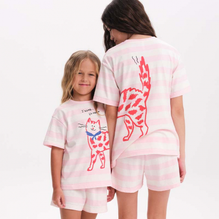 Состав: верх: 100%хлопок, низ: 100%хлопокОписание: Стильная и уютная пижама актуального цвета для девочки. В составе ткани 100% хлопка — идеально для детской одежды! Модель приятна на ощупь, прекрасно пропускает воздух, позволяя коже ребёнка дышать. При этом в пижаме из хлопка ребёнку будет уютно, даже если он сбросит одеяло. Всё это обеспечивает комфортный и качественный сон. Свободная футболка и комфортные шорты, плечо немного спущено, рукава широкие — в пижаме очень удобно спать. Широкая и мягкая резинка в поясе не перекручивается и не давит. Отделка горловины из эластичной рибаны — она не растягивается, ребёнку удобно надевать и снимать пижаму. Футболку украшает позитивный принт в виде кошечки. Надпись переводятся: "люблю море". Домашний комплект — замечательный подарок дочке, внучке, сестре на любой праздник. Выбирайте нужный размер по таблице размеров на фото. Цвет товара на экране вашего устройства может отличаться от цвета изделия вживую.