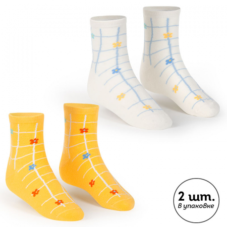Состав: 76%хлопок 21%полиэстер 3%эластанОписание: Стильный набор детских носков. В комплект входят 2 пары. Мягкая резинка не пережимает ногу, при этом носки надёжно зафиксированы и не сползают. В составе ткани преобладает хлопок — носки мягкие, отлично пропускают воздух, позволяя коже ребенка дышать. Благодаря полиэстеру и эластану носки износостойкие, хорошо тянутся, прекрасно переносят многочисленные стирки. Милые носки подходят для повседневной носки в школу, детский сад, а также для спортивных тренировок и прогулок. Одна пара в наборе жёлтого цвета, вторая — белого. Обе пары украшает вытканный узор в виде клетки, будто нарисованной от руки, и цветочков. Модные носки станут отличным дополнением образа. Размерная линейка: 12-14, 14-16, 16-18, 18-20, 20-22. Подходят для круглогодичного применения. Набор носков детских станет отличным подарком для ребёнка на любой праздник. Выбирайте нужный размер по таблице размеров на фото. Цвет товара на экране вашего устройства может отличаться от цвета изделия вживую. Товар возврату и обмену не подлежит.