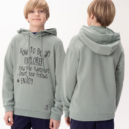 Состав: 87%хлопок 13%полиэстерОписание: Худи для мальчика – актуальная вещь в любом сезоне. Кофта спортивная для мальчика выполнена из плотного футера-петля, который отлично согревает в прохладную погоду и при этом хорошо пропускает воздух – ребенок активно двигается, играет, не потеет. Толстовка свободного покроя оверсайз со спущенным плечом, углубленной проймой. Рукава а также низ изделия на манжете из рибаны. Кофта без карманов. Капюшон с регулировкой объема. По переду изделие украшено принтом с надписью и нашивкой. Перевод надписей "how to be an explorer: find your adventure, invite your friends, enjoy" - как стать исследователем: найди свое приключение, пригласи своих друзей, наслаждайся. Размерный ряд подходит как для малышей так и для подростков. Эта универсальная толстовка отличный вариант в демисезонную погоду, ее можно надеть под куртку и в ней не будет жарко.