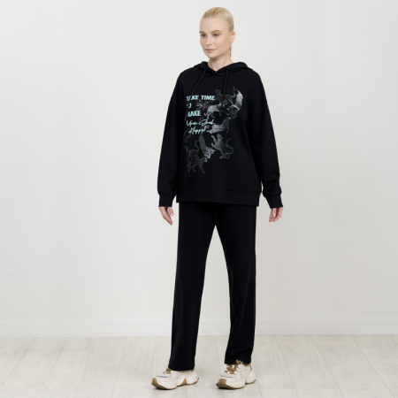Состав: верх: 96%хлопок 4%эластан, низ: 96%хлопок 4%эластанОписание: Костюм женский Pelican. В наборе 2 вещи: толстовка, брюки. Кофта с капюшоном среднего объема с крупным эластичным glossy принтом тон в тон. Перевод Найдите время, чтобы сделать свою душу счастливой. Штаны прямые с высокой посадкой без манжет, с карманами по бокам. Дополнительная регулировка объема декоративным шнуром по талии. В составе ткани качественный хлопок и эластан, поэтому изделие хорошо пропускает воздух, долго сохраняет форму даже после множества стирок, эластичное и износостойкое, практичное для регулярного применения. Материал приятный для соприкосновения с кожей. Красивая нарядная одежда для женщин представлена в популярном цвете: черный. В широкой сетке маленьких, средних и больших размеров XS (42), S (44), M (46), L (48), XL (50). Универсальный тип ростовки для высоких, среднего роста и низких. Классно сочетается с различными предметами гардероба. Подберите комплект в официальном каталоге селлера. Иногда такой тип одежды называют оверсайз майка с рукавами, топ, поддева, трико, треники, так как изделие обладает похожими свойствами. Подходит для кругологодичного применения: летом, зимой, весной, осенью (демисезон и в межсезонье). Одинаково практично для повседневной носки, в домашних условиях, для занятий фитнесом и йогой, гимнастикой и танцами, бегом, спортом, для активного отдыха и прогулок на велосипеде. В таком ты понимаешь - это твое, это топ! Девушка будет в восторге от молодежной вещи, ведь это базовая модель в гардеробе. Изделие дарят сами себе женщины (или друг другу, например, сестра или мама может вручить такой подарок), а также их мужчины на День рождения, 8 марта, Новый год и Рождество, на 14 февраля.