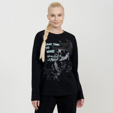 Состав: 95%хлопок 5%эластанОписание: Лонгслив женский Pelican. Модель среднего объема. Крупный эластичный glossy принт на полутонах. Перевод Найдите время, чтобы сделать свою душу счастливой. В составе ткани качественный хлопок и эластан, поэтому изделие хорошо дышит, долго сохраняет форму даже после множества стирок, эластичное и износостойкое, практичное для регулярного применения. Красивая нарядная одежда для женщин представлена в популярном цвете: черный. В широкой сетке маленьких, средних и больших размеров: XS (42), S (44), M (46), L (48), XL (50). Универсальный тип ростовки для высоких, среднего роста и низких. Классно сочетается с различными предметами гардероба: брюки и штаны, джинсы и леггинсы, куртка и парка. Подберите комплект в официальном каталоге селлера. Иногда такой тип одежды называют оверсайз толстовка, свитшот, блейзер, джемпер, кофта, футболка с длинными рукавами, так как изделие обладает похожими свойствами. Подходит для кругологодичного применения: летом, зимой, весной, осенью (демисезон и в межсезонье). Одинаково практично для повседневной носки, в домашних условиях, для занятий фитнесом и йогой, гимнастикой и танцами, бегом, спортом, для активного отдыха и прогулок на велосипеде. Можно пойти на свидание или встречу с друзьями, а можно гулять по пляжу, чувствуя легкий ветерок, путешествовать и танцевать в клубе до упаду. В таком ты понимаешь - это твое, это топ! Девушка будет в восторге от молодежной вещи, ведь это базовая модель в гардеробе. Изделие дарят сами себе женщины (или друг другу, например, сестра или мама может вручить такой подарок), а также их мужчины на День рождения, 8 марта, Новый год и Рождество, на 14 февраля.