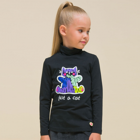 Состав: 93%хлопок 7%эластанОписание: Водолазка детская для девочки. Лонгслив модного свободного силуэта подарит ребёнку комфорт и свободу движений. Водолазка с длинным рукавом дополнена воротником-стойкой, который защищает шею от холода и ветра — нет необходимости дополнительно надевать шарф. Модель неприхотлива в уходе. В составе ткани пребладает высококачественный хлопок — джемпер мягкий и отлично пропускает воздух, давая коже ребёнка дышать. Эластан помогает изделию сохранить прекрасную форму надолго. Водолазка с принтом по переду. Принт эластичный и стойкий, великолепно переносит многочисленные стирки. На принте изображён котик, надпись переводится «просто кот». В шве левого рукава вшита декоративная деталь - лапка котенка. Порадует любую девочку. Джемпер с воротником выполнен в классическом чёрном цвете, его легко сочетать с любыми брюками, джинсами, леггинсами, юбками. Размерный ряд от года до 11-12 лет. Водолазка с горлом станет отличным дополнением гардероба для маленьких девочек дошкольного и младшего школьного возраста, а также девочек-подростков. Его можно носить в детский сад, на прогулки, отдых, а также дома. Водолазка подходит для круглогодичного применения: летом, осенью, зимой, весной и демисезон. В осенне-зимний период идеальна в качестве поддевы под верхний слой одежды. Отличный подарок дочери, внучке или сестре на Новый год и любой другой праздник.