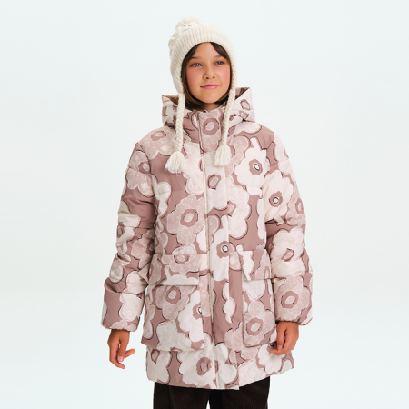 Состав: 100%полиэстер, подклад: 100%полиэстер, утеплитель: экопух 100%полиэстерОписание: Куртка зимняя для девочки — стильный и тёплый зимний пуховик на синтепухе, рассчитанный на температуру до ?30 °C. Модель доступна в размерах от 98 см (?3 года) до 146 см (?11 лет) и подойдёт для детсадовцев и школьниц. Фасон умеренного объёма, с горизонтальной стёжкой, выглядит аккуратно и современно. В области талии расположен горизонтальный подрез, в который встроены объёмные прямоугольные карманы с клапанами. Они застёгиваются на магниты и надёжно фиксируют вещи. По планке и клапанам убраны отстрочки, благодаря чему куртка сохраняет ощущение пухлости и мягкости. Функциональные детали делают модель удобной в носке: низ рукава собран на внутреннюю резинку и дополнен трикотажной манжетой из рибаны, которая препятствует задуванию холодного воздуха. Центральная молния защищена ветрозащитной планкой и дополнительно фиксируется на липучку (велкро). По низу изделия предусмотрена внутренняя утяжка на эластичный корд для защиты от продувания. Капюшон двухшовный, с объёмной вставкой вокруг лица и регулируется утяжкой на круглую резинку со стопперами. Внутри есть карман на молнии для мелочей. Подклад многозональный: флис в верхней части переда и спинки добавляет тепло и уют, а полиэстер внизу облегчает движения и делает пуховик более комфортным. Главная особенность модели — all-over принт с крупными акварельными цветами. Такой дизайн создаёт настроение тепла и уюта, выглядит душевно и одновременно роскошно. Для родителей это плюс: куртка остаётся практичной и защищённой от холода, но при этом подчёркивает индивидуальность ребёнка. Для девочек это возможность чувствовать себя стильной и модной. Это настоящий тренд зимнего сезона, который можно охарактеризовать как «роскошь офлайна». Ткань верха имеет водоотталкивающую пропитку, которая защищает от снега и влаги. Светоотражающие элементы в боковых швах и на спинке повышают безопасность в тёмное время суток. Эта зимняя куртка для девочки с цветочным принтом сочетает тепло, комфорт и актуальный дизайн.