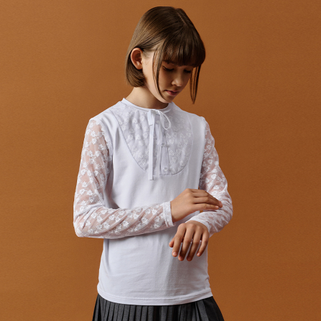 Состав: 93%хлопок 7%эластан, вставка: 90%полиамид 10%эластанОписание: Блузка школьная для девочки на 1 сентября — нарядная, кружевная, удобная Трикотажный лонгслив для школы — идеальный выбор для учебных будней и торжественных линеек. Модель выполнена из мягкого эластичного хлопкового трикотажа с кружевными элементами. Ткань приятна к телу, хорошо тянется, не сковывает движений и отлично подходит для длительной носки. Размерная линейка рассчитана на начальную школу и среднее звено. Подойдет первоклашкам и девочкам начальной школы до 5 класса. Особенности модели: Фигурная кокетка овальной формы в зоне декольте — делает образ аккуратным и нарядным Кокетка двойная: нижний слой — трикотаж, верхний — эластичное кружевное полотно, которое не колется и не раздражает кожу Планка с тремя пуговицами по центру — изящный классический элемент, который подчёркивает стиль школьной формы Длинные облегающие кружевные рукава делают образ лёгким и элегантным Уютная горловина с мягкой трикотажной бейкой и бантиком из репсовой ленты — милый акцент, который оценят девочки. Блузка идеально подойдет в качестве парадной школьной формы на линейку 1 сентября, выпускной или же элемента повседнейвной школьной формы. Преимущества: Отлично подходит как школьная форма для девочек Стильная и нарядная блузка для праздников, линеек, концертов Комфортна даже при длительной носке — мягкий материал и удобный крой Легко стирается, не теряет форму и цвет Универсальна: сочетается с юбками, брюками, сарафанами Используйте таблицу размеров на фотографии, чтобы выбрать подходящий размер. Большая размерная сетка позволит подобрать хлопковый джемпер, как для юных первоклассниц, так и девочкам среднего звена. Обратите внимание, что цвет товара на экране вашего устройства может отличаться от реального.