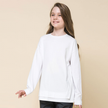 Состав: 93%хлопок 7%эластанОписание: Трикотажный джемпер легкого А-силуэта со спущенным плечом для девочки. В составе ткани преобладает хлопок — модель дышащая, мягкая и приятная на ощупь. Эластан помогает сохранять форму даже после частых стирок. Объемный крой, спущенное плечо – настоящий трендовый оверсайз. В лонгсливе комфортно в течение всего дня, ничего не давит, не колет, не сковывает движения. Рукав книзу заужен — красиво садится по руке. Оригинальный крой создаёт эффект многослойности, двух надетых друг на друга изделий — один из актуальных модных трендов. Изюминка модели — ассиметричный боковой шов, украшенный деликатными кнопками в тон. Такой джемпер можно брать на вырост — благодаря увеличенному объёму он долго не станет малым. Отличный вариант модной школьной формы для девочек.