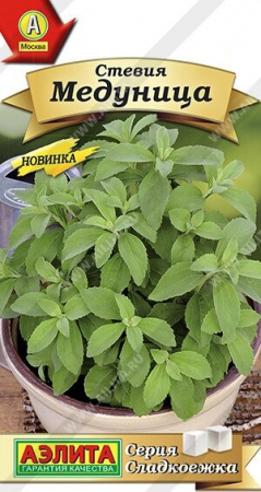 Натуральный природный заменитель сахара. В листьях содержится стевиозид – подсластитель, который в сотни раз слаще сахарозы. Одной щепотки порошка стевии достаточно, чтобы заменить одну чайную ложку сахара. Особенно рекомендуется диабетикам, так как регулирует уровень сахара в крови, способствует уменьшению холестерина и радионуклидов, а также выработке поджелудочной железой инсулина. Период от посева до сбора урожая листьев – 60-75 дней. Растение многолетнее, но в средней полосе культивируется как однолетник, не зимует. Можно выращивать в горшках и сохранить зимой. Кусты высотой от 45 до 90 см (зависит от агротехники).