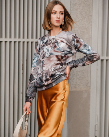 Самые смелые и самые нежные дизайнерские принты для вашего гардероба нанесены методом сублимационной печати, которая делает рисунок ярким и очень устойчивым. Устойчивым настолько, что ему не страшны машинные стирки. Цвет сохраняет сочность на протяжении нескольких сезонов.