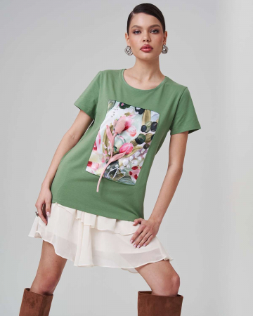 Особенность нашей новинки - нежнейший цветок тюльпана из органзы, изящно дополняющий авторский рисунок от наших художников. Ещё одна изюминка данной модели - жемчужные бусины, лаконично располагающиеся на бутонах отрисованных цветов. Шелк элегантно переливается и прекрасно сочетается с матовым хлопком.