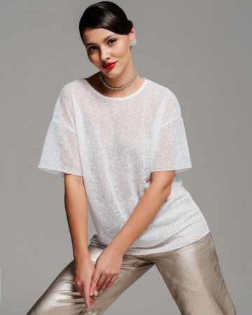 Футболка женская из полупрозрачной эластичной сетки с узором имеет свободный крой с эффектом оверсайз. Смотрится очень стильно и современно.