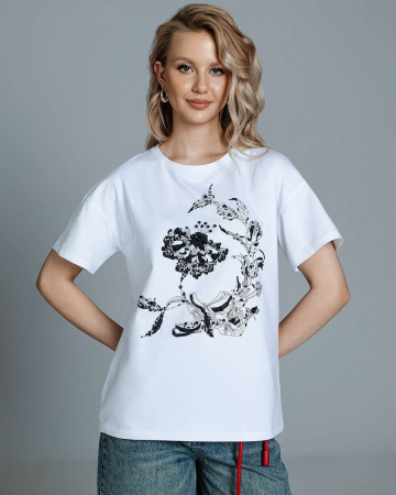 Футболка с чёрными бусинами– это способ выразить свою индивидуальность, добавить оригинальности в повседневность и подчеркнуть утонченный вкус. Принт цветы с дополнительным декором, делает рисунок объёмным и создаёт 3Д эффект.