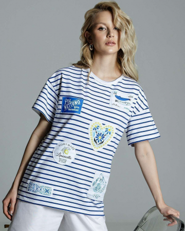 Женская летняя футболка в полоску из мягкого хлопка — идеальный выбор для комфортного и стильного образа. Оверсайз модель подходит как для повседневной носки, так и для будущих мам, обеспечивая свободу движений и удобство. Футболка украшена итальянским принтом и оригинальными нашивками с изображениями цветочков, рыбки и стильных надписей, что придает изделию уникальный и модный вид. Приятная на ощупь, дышащая ткань делает эту модель незаменимой в теплое время года.