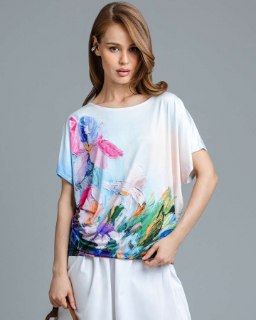Футболка "Кимоно-баллон" из вискозной ткани "Венеция" с полной запечаткой авторским принтом. Это тонкий плотный трикотаж с матовой поверхностью, мягкий и шелковистый на ощупь, не образует катышков. Защипы чуть ниже талии позволяют скрыть проблемные зоны фигуры. Принт наносится таким образом, что краска введена в саму текстуру ткани и надежно там закреплена. Трикотаж остается эластичным, нет никаких слоев нанесения сверху ткани. Благодаря такой технологии рисунок остается ярким даже после многочисленных стирок.