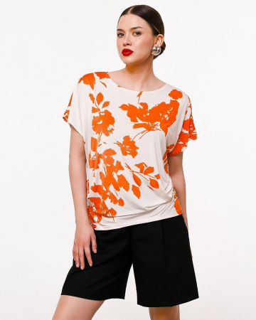 Футболка "Кимоно-баллон" из принтованной вискозной ткани "Венеция". Это тонкий плотный трикотаж с матовой поверхностью, мягкий и шелковистый на ощупь, не образует катышков. Защипы чуть ниже талии позволяют скрыть проблемные зоны фигуры.