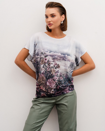 Футболка "Кимоно-баллон" из вискозной ткани "Венеция" с полной запечаткой авторским принтом. Это тонкий плотный трикотаж с матовой поверхностью, мягкий и шелковистый на ощупь, не образует катышков. Защипы чуть ниже талии позволяют скрыть проблемные зоны фигуры. Принт наносится таким образом, что краска введена в саму текстуру ткани и надежно там закреплена. Трикотаж остается эластичным, нет никаких слоев нанесения сверху ткани. Благодаря такой технологии рисунок остается ярким даже после многочисленных стирок.