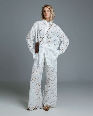 Женские брюки на резинке с оригинальным шитьём – идеальный выбор для лета. Выполнены из 100% хлопка с узорно-рельефной фактурой и изящным орнаментальным рисунком, эти брюки обеспечивают комфорт и свежесть даже в жаркую погоду. Свободная посадка и прямой крой подходят для девушек высокого роста, подчеркивая легкость образа без стеснения движений.