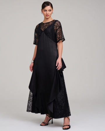 Платье макси с драпировкой из кружева эффектно подчёркивает грудь и скрывает недостатки в области талии и бёдер.