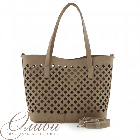 Сумка женская Оливи, имеет одно основное отделение без застежки. В комплект к сумке идет дополнительная внутренняя сумка на застежке молнии и с регулируемом ручкоремнем.Внутри: карман на молнии, открытый карман. Задняя стенка: карман на молнии.