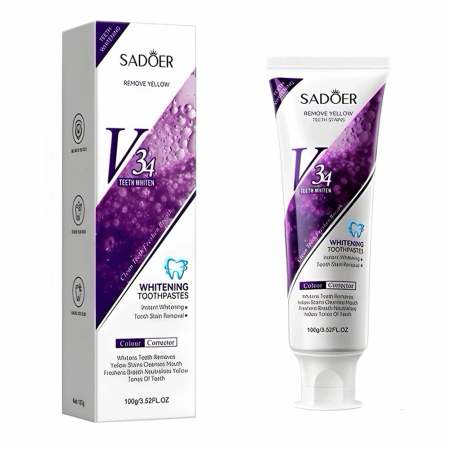 SADOER представляет фиолетовую пасту для отбеливания зубов. Она разработана для глубокой очистки зубов. Паста эффективно удаляет пятна и зубной камень. Она также устраняет желтизну и осветляет цвет зубов. Ваши зубы станут заметно белее и ярче.