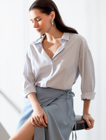 Блузка белого цвета в голубую полоску свободного силуэта отлично подходит для повседневной носки и создания стильных образов. Благодаря хлопку с добавлением эластана ткань хорошо дышит, освежает и подходит для работы даже в жаркое время года. Натуральный материал выглядит аккуратно даже после многочисленных стирок. Рубашка отличается удлиненной спинкой, что удобно для разных вариантов сочетания одежды. Принт в горизонтальную и вертикальную полоску подчеркивет индивидуальность и добавляет стильный акцент. Свободный крой блузки и спущенная линия плеча позволяют вписать эту вещь в любой гардероб, независимо от выбранного стиля — будь то офисная атмосфера или расслабленный выход на прогулку. Отложной воротник аккуратно подчеркивает утонченную линию шеи и придает образу завершенность. Застежка на пуговицы обеспечивает комфортную регулировку и удобство в использовании. Универсальный фасон рубашки хорошо смотрится на любые размеры, в том числе и большие, скрывает возможные недостатки и выгодно подчеркивает достоинства фигуры.