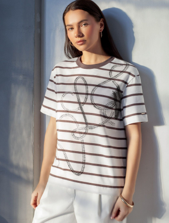 Модная футболка белого цвета в широкую горизонтальную полоску кофейного цвета привлекает внимание своим интересным дизайном и ярким принтом. Благодаря прямому крою изделие комфортно садится на любую фигуру, в том числе на большие размеры, и не сковывает движений. Круглый вырез подчеркивает современный стиль, а натуральный материал плотностью 170 Г/м2 из хлопка с добавлением эластана обеспечивает удобство в повседневной носке и приятные тактильные ощущения. Прочность и износостойкая структура позволяют сохранять свежий внешний вид после множества стирок. Принт в виде букв логотипа бренда нанесен красками с устойчивым покрытием. Стильная футболка гармонично вписывается в любой гардероб и подойдет для прогулок, отдыха или неформальных встреч. Благодаря особенностям кроя модель хорошо сидит, скрывая недостатки и подчеркивая достоинства. Яркая футболка идеально сочетается с базовыми вещами, позволяя создавать новые интересные образы каждый день.