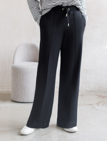Брюки черного цвета прямого кроя выполнены из премиального футера-двухнитки. Лаконичный силуэт поддерживают застроченные стрелки, зрительно вытягивающие силуэт. Удобный пояс на резинке регулируется хлопковым шнурком с золотистой фурнитурой. Наличие эластана в составе изделия гарантирует комфорт и долговечность изделия. Эластичный материал хорошо пропускает воздух, позволяя телу дышать, и легко тянется, не ограничивая движения.