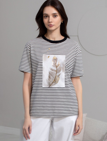 Модная футболка белого цвета в тонкую горизонтальную черную полоску привлекает внимание своим интересным дизайном и ярким принтом. Благодаря прямому крою изделие комфортно садится на любую фигуру, в том числе на большие размеры, и не сковывает движений. Круглый вырез подчеркивает современный стиль, а натуральный материал плотностью 170 Г/м2 из хлопка с добавлением эластана обеспечивает удобство в повседневной носке и приятные тактильные ощущения. Прочность и износостойкая структура позволяют сохранять свежий внешний вид после множества стирок. Принт в виде пера нанесен красками с устойчивым покрытием.Стильная футболка гармонично вписывается в любой гардероб и подойдет для прогулок, отдыха или неформальных встреч. Благодаря особенностям кроя модель хорошо сидит, скрывая недостатки и подчеркивая достоинства. Яркая футболка идеально сочетается с базовыми вещами, позволяя создавать новые интересные образы каждый день.