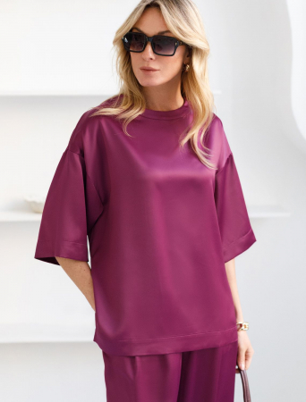Блузка с короткими рукавами цвета бургунди из струящегося плотного сатина создана для ценительниц комфорта и элегантности. Материал отличается высокой плотностью, что делает блузку устойчивой к износу и сохраняет аккуратный внешний вид даже при длительном использовании. Струящаяся ткань элегантно ложится по фигуре, подчеркивая достоинства силуэта без лишней утяжеленности, в тоже время приятно ощущается на теле.