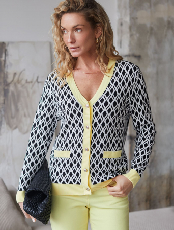 Кардиган с V-вырезом жаккардовой вязки — универсальная и женственная вещь для весны и лета. Бело-черный жакет выполнен из приятной к телу вискозы, отличается в меру свободным кроем, который подчеркивает силуэт. V-вырез подчеркивает зону декольте и визуально вытягивает шею, делая фигуру более изящной. Спущенная линия плеча создает расслабленный силуэт, добавляя комфорта и свободы движений, что отлично подойдет для девушек и женщин плюс сайз размеров. Модель на пуговицах обеспечивает удобство в носке и добавляет классическую нотку образу. Контрастная отделка гармонично сочетается с выразительным геометрическим рисунком, который придает образу индивидуальность и современность. Принт немного напоминает благородный орнамент аргайл, Карманы-обманки украшают, сохраняя лаконичность внешнего вида, Кардиган средней длины оптимален для создания разных комбинаций на каждый день. Такой жакет легко впишется в офисный или повседневный образ благодаря своей универсальности и современному стилю. Вискоза дарит ощущение комфорта даже в теплую погоду, а качественная жаккардовая вязка сохраняет форму после стирки.
