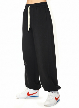 Брюки для мальчика из трикотажного полотна "футер-двунитка" на притачном поясе с эластичной тесьмой внутри, декоративными вставками в боковых швах и карманами, обработанными в соединительных швах передних половин с декоративными вставками. Нижние срезы брюк обработаны с эластичной тесьмой. По швам втачивания вставок и входам в карманы настрочены отделочные строчки. Через петлю пояса продет шнрок, позволяющий регулировать степень прилегания изделия по талии.