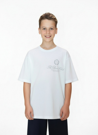 Футболка для мальчика из трикотажного полотна "кулирка" с приспущенным плечом, втачными короткими рукавами, горловиной овальной формы, обработанной втачной планкой и принтом на полочке, выполненным в технике шелкографии. По шву втачивания планки в горловину настрочена отделочная строчка.