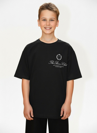 Футболка для мальчика из трикотажного полотна "кулирка" с приспущенным плечом, втачными короткими рукавами, горловиной овальной формы, обработанной втачной планкой и принтом на полочке, выполненным в технике шелкографии. По шву втачивания планки в горловину настрочена отделочная строчка.