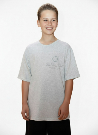 Футболка для мальчика из трикотажного полотна "кармеланж" с приспущенным плечом, втачными короткими рукавами, горловиной овальной формы, обработанной втачной планкой и принтом на полочке, выполненным в технике шелкографии. По шву втачивания планки в горловину настрочена отделочная строчка.