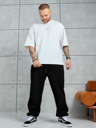 Брюки мужские из трикотажного полотна "футер-3-нитка с начесом", на притачном поясе с эластичной тесьмой внутри, с карманами в боковых швах. Нижние срезы обработаны подгибкой с эластичной тесьмой. Для регулирования степени прилегнания изделия по линии талии предусмотрен декоративный шнурок, вставленный в пояс и продетый через две обметанные петли в центре.