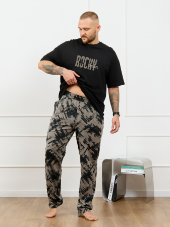 Костюм мужской, состоящий из футболки и брюк. Футболка однотонная с принтом на груди; модель свободная, со спущенной линией плеч, овальным вырезом горловины. Брюки из полотна с набивным рисунком эксклюзивного дизайна, прямые, с боковыми карманами с обтачными входами, на притачном поясе с отстроченной эластичной тесьмой.
