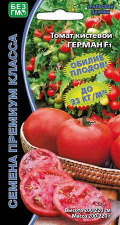 Гибрид ГЕРМАН – настоящий дамский угодник. Высокий (200-220 см), статный, хорошо сложенный – вскружит голову кому угодно. А какой он любитель удивлять подарками – пурпурно-малиновыми, крупными (по 200-220 г) плодами, превосходного вкуса. Герман F1 – раннего срока созревания, после всходов вступает в плодоношение уже через 93-95 дней. Невероятные урожаи вам гарантированы, если будете уделять этому соблазнителю должное внимание. Так, в первые два сбора с одного квадратного метра можно получить свыше 9 кг аппетитнейших, красивейших, обалденно-вкусных помидоров. И такой результат только в начале плодоношения. Потенциальная же урожайность гибрида – 20-23 кг/м2. Растение индетерминантное (не ограниченное в росте), крепкое, слабооблиственное, имеет простую кисть, в которой, как правило, по 6-8 томатов, обладает сильным иммунитетом к альтернариозу и вирусу табачной мозаики. Первая кисть закладывается над 6-7 листом, последующая – через 1-2. Плоды округлой формы, очень крепкие, плотные, поэтому прекрасно переносят любую транспортировку. Каждый раз при поедании свежего салата или нарезки, вы будете получать истинное кулинарное наслаждение от этого томатного «бойфренда».